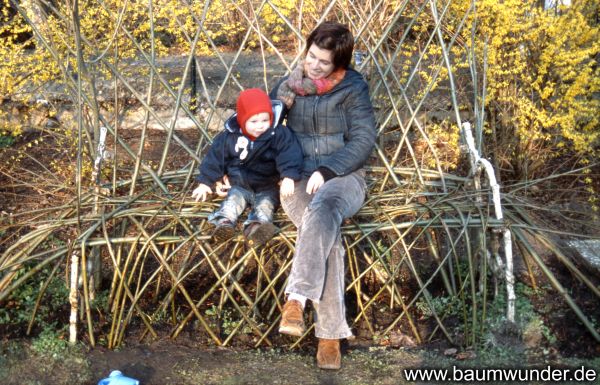 Aus Weiden können nicht nur Häuser gebaut werden sondern auch Möbelstücke oder andere Dinge für den Garten. Diese Weidenbank wird an den Seiten von den Metallteilen einer ehemaligen Holzbank unterstützt.