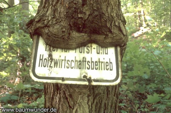 Selbst die Förster nageln hemmungslos die Schilder an die Bäume, wie hier an einer Ulme.